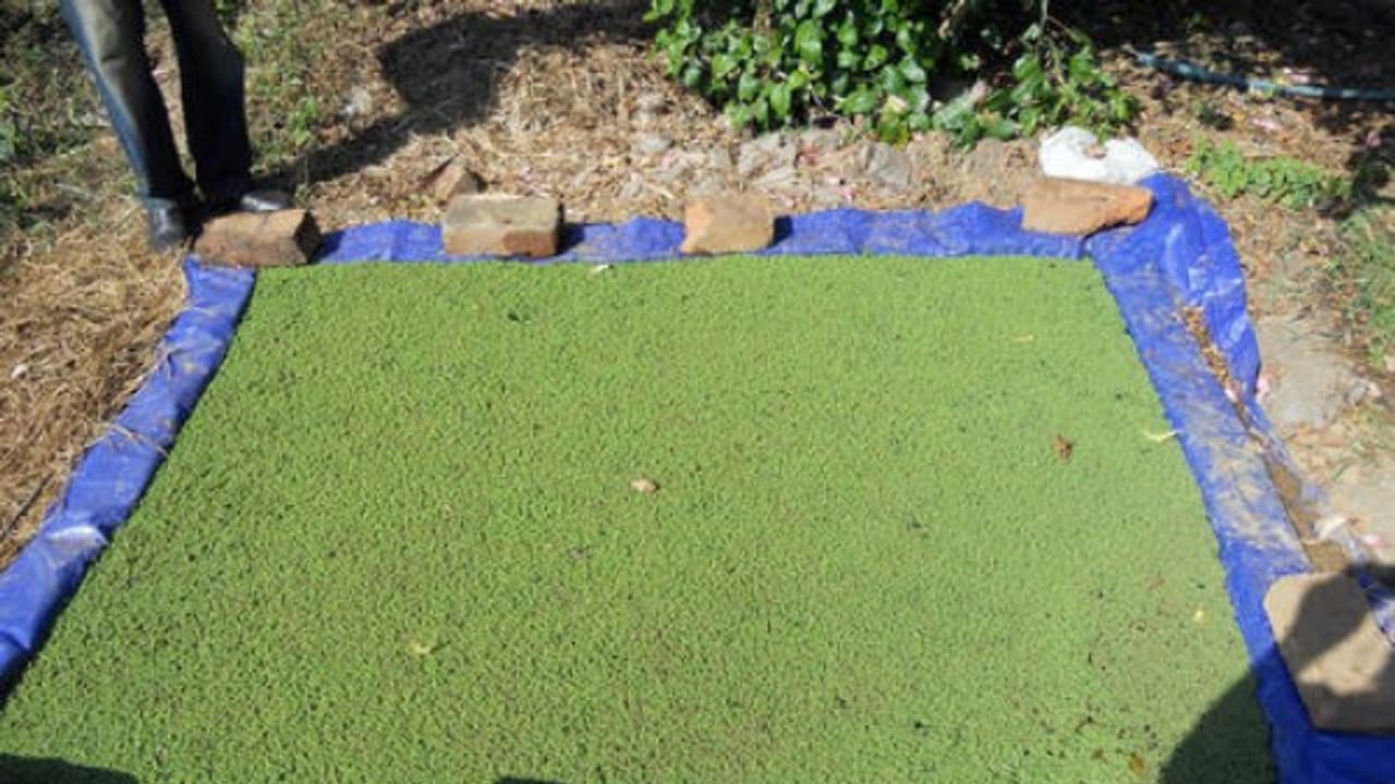 6. 500-1000 கிராம் சுத்தமான அசோலா விதைகளை போட்டு அதன் மேல் லேசாக தண்ணீர் தெளிக்கவும்.