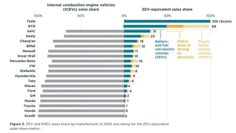 இந்த மதிப்பீட்டின்படி, BYD என்பது முற்றிலும் மின்சாரத்தில் இயங்கும் ஒரே வாகன உற்பத்தியாளர் ஆவார்கள். இந்த நிறுவனம் டெஸ்லாவுக்கு போட்டியாக உள்ளது. இந்த மதிப்பீட்டில் டெஸ்லா முதலிடத்தில் உள்ளது. இது ZEV களின் மிகப்பெரிய உற்பத்தியாளர் ஆகும். ஆனால் பல அளவீடுகளில் குறைவான செயல்திறன் கொண்டது. பாரம்பரிய வாகன உற்பத்தியாளர்களான BMW மற்றும் Volkswagen ஆகியவை EV மாற்றம் குறித்து தீவிரமாக உள்ளன.