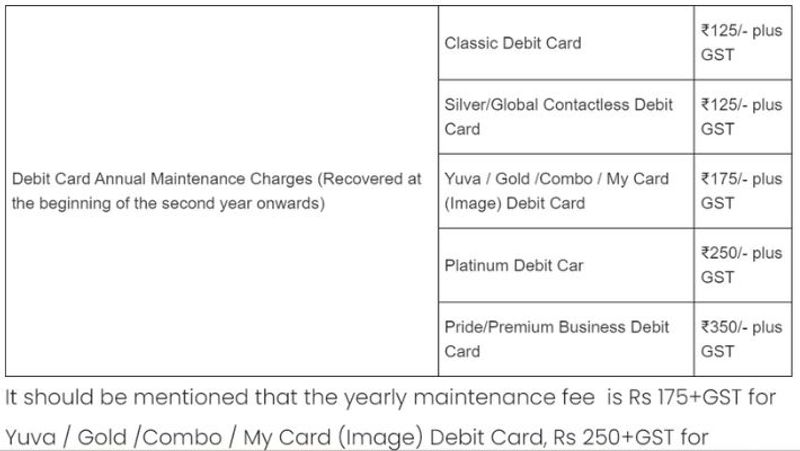 யுவா / கோல்ட் / காம்போ / மை கார்டு (படம்) டெபிட் கார்டுக்கு ரூ. 175+GST, பிளாட்டினம் டெபிட் கார்டுக்கு ரூ.250+ஜிஎஸ்டி, பிரைட் / பிரீமியம் பிசினஸ் டெபிட் கார்டுகளுக்கு ரூ.350 + ஜிஎஸ்டி ஆகியவை வருடாந்திர பராமரிப்புக் கட்டணம் என்பதைக் குறிப்பிட வேண்டும். . உங்கள் டெபிட் கார்டை மாற்றவோ அல்லது மாற்றவோ விரும்பினால், சேவைக் கட்டணத்துடன், வங்கி ரூ. 300 + ஜிஎஸ்டியை வசூலிக்கிறது. மேலும், SBI டெபிட் கார்டு வருடாந்திர பராமரிப்பு கட்டணங்கள் இரண்டாம் ஆண்டின் தொடக்கத்தில் வசூலிக்கப்படும் என்பதை நினைவில் கொள்ளுங்கள்.