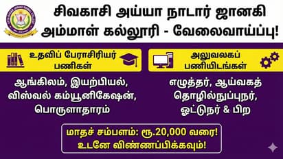 விருதுநகர் மாவட்டம், சிவகாசியில் அமைந்துள்ள புகழ்பெற்ற ஐயா நாடார் ஜானகி அம்மாள் கல்லூரியில் (Ayya Nadar Janaki Ammal College - ANJAC) காலியாக உள்ள பல்வேறு பணியிடங்களை நிரப்புவதற்கான அறிவிப்பு வெளியாகியுள்ளது. ஆசிரியர் மற்றும் ஆசிரியர் அல்லாத பணியிடங்களுக்குத் தகுதியானவர்களிடமிருந்து விண்ணப்பங்கள் வரவேற்கப்படுகின்றன.