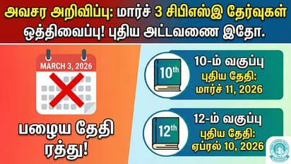 மத்திய இடைநிலைக் கல்வி வாரியம் (CBSE), வரும் மார்ச் 3, 2026 அன்று நடைபெறவிருந்த 10 மற்றும் 12-ம் வகுப்பு பொதுத்தேர்வுகளை ஒத்திவைப்பதாக அதிரடியாக அறிவித்துள்ளது. நிர்வாகக் காரணங்களுக்காக (Administrative reasons) இந்த முடிவு எடுக்கப்பட்டுள்ளதாக வாரியம் தெரிவித்துள்ளது. இந்த தேதி மாற்றம் ஒரு குறிப்பிட்ட நாளில் நடைபெறும் தேர்வுகளுக்கு மட்டுமே பொருந்தும் என்றும், மற்ற தேர்வுகள் திட்டமிட்டபடி நடைபெறும் என்றும் சிபிஎஸ்இ தெளிவுபடுத்தியுள்ளது.