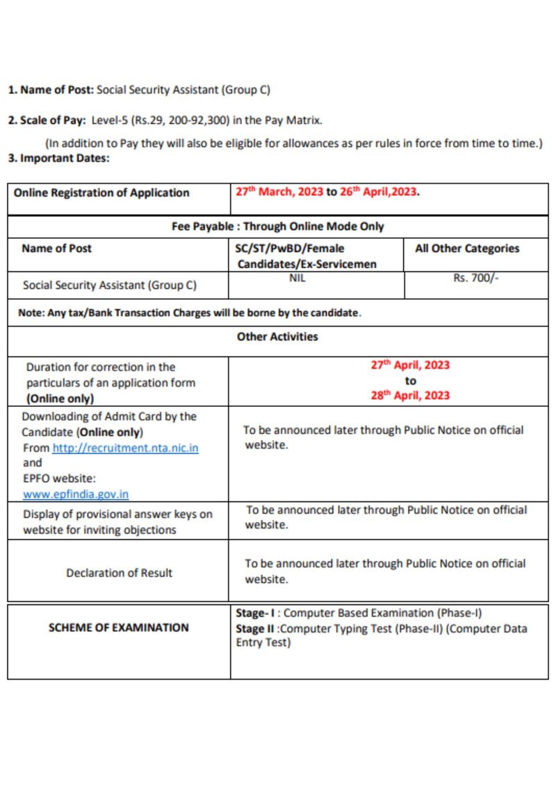 அவற்றில் 2674 காலியிடங்கள் சமூக பாதுகாப்பு உதவியாளர் பதவிக்கும், 185 காலியிடங்கள் ஸ்டெனோகிராபர் (குரூப் சி) பதவிக்கும் உள்ளன. இரண்டு பதவிகளுக்கும் விண்ணப்பிப்பவர்கள் 18 முதல் 27 வயதுக்குள் இருக்க வேண்டும். பொது / EWS / OBC ஆகிய இரு பதவிகளுக்கும் விண்ணப்பக் கட்டணம் 700 ஆகும். SC/ST* PwBD, பெண் வேட்பாளர்கள் அல்லது முன்னாள் ராணுவ வீரர்களுக்கு கட்டணம் செலுத்துவதில் விலக்கு அளிக்கப்பட்டுள்ளது.