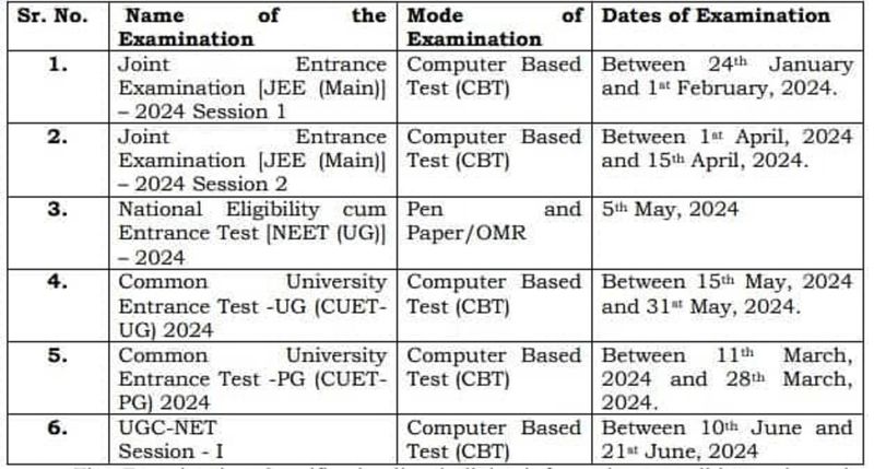 2023ஆம் ஆண்டில், ஜேஇஇ தேர்வின் முதன்மை அமர்வு 1 ஜனவரி 24 மற்றும் ஜனவரி 31 க்கு இடையில் நடைபெற்றது. இளநிலை மருத்துவப் படிப்புகளுக்கான நீட் தேர்வு 2023 மே 7 அன்று நடத்தப்பட்டது. கடந்த ஆண்டுகளின் போக்குப்படி, 2024ஆம் ஆண்டு மே 5ஆம் தேதி நடைபெறும். 2023 இல் கியூட் (CUET UG) தேர்வு மே 21 மற்றும் ஜூன் 23 முதல் கட்டங்களாக நடைபெற்றது.