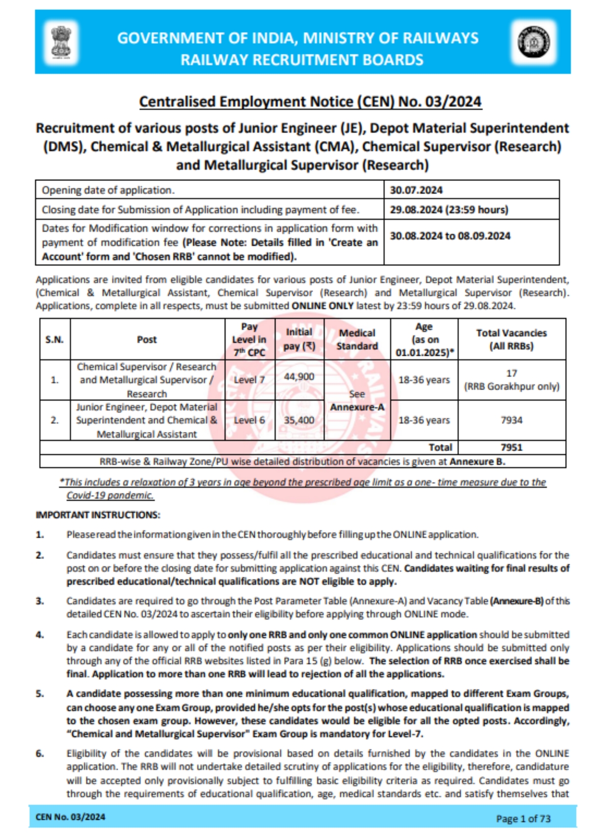ரயில்வே ஆட்சேர்ப்பு வாரியம் (RRB) இந்திய ரயில்வேயில் 7,951 வேலை காலியிடங்களை நிரப்பும் அறிவிப்பை வெளியிட்டுள்ளது. விண்ணப்பிக்கும் தேர்த்தியானது ஜூலை 30 அன்று தொடங்கியது. ஆகஸ்ட் 29 வரை திறந்திருக்கும். காலியிடங்களில் ஜூனியர் இன்ஜினியர் (JE) மற்றும் மெட்டீரியல் சூப்பிரண்டுக்கான 7,934 பணியிடங்களும், ரசாயன மேற்பார்வையாளர், உலோகவியல் உதவியாளர் மற்றும் ஆராய்ச்சிப் பணிகளுக்கான 17 பணிகளும் அடங்கும். ஆர்வமுள்ள விண்ணப்பதாரர்கள் அதிகாரப்பூர்வ ஆர்ஆர்பி (RRB) இணையதளம் மூலம் விண்ணப்பிக்கலாம். அதிகாரபூர்வ ஆர்ஆர்பி இணையதளத்திற்குச் சென்று விண்ணப்பிக்கலாம் என்று தெரிவிக்கப்பட்டுள்ளது.