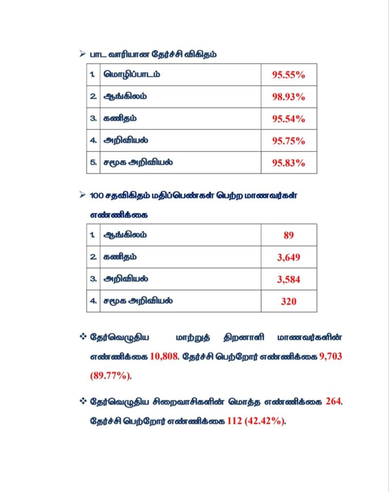 மாணவர்களை விட மாணவியர்கள் 6.5% அதிகம் தேர்ச்சி பெற்றுள்ளனர். கடந்த ஆண்டை விட இந்த ஆண்டு தேர்ச்சி விகிதம் அதிகரித்துள்ளது. ஆங்கிலத்தில் 89 பேர் 100க்கு 100 மதிப்பெண் பெற்றுள்ளனர். மாணவர்களை விட மாணவியர்கள் 6.5% அதிகம் தேர்ச்சி பெற்றுள்ளனர். கடந்த ஆண்டை விட இந்த ஆண்டு தேர்ச்சி விகிதம் அதிகரித்துள்ளது. ஆங்கிலத்தில் 89 பேரும், கணிதம் - 3,649 பேரும், அறிவியல் 3 584, சமூக அறிவியலில் 320 பேர் 100க்கு 100 மதிப்பெண் பெற்றுள்ளனர். அரசு உதவிபெறும் பள்ளிகளில் 92.24 % பேர் தேர்ச்சி பெற்றுள்ளனர்.