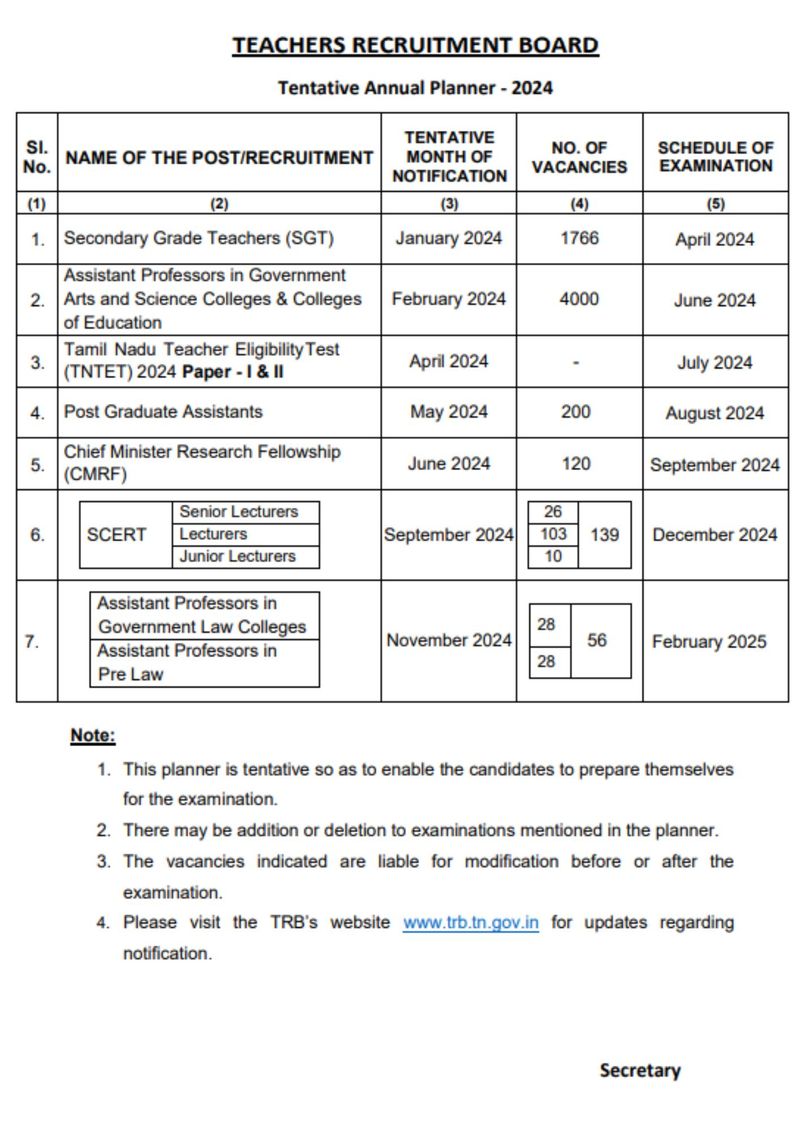 டெட் தேர்வுக்கான காலிப் பணியிடங்களின் எண்ணிக்கை இதில் அறிவிக்கப்படவில்லை. முதுநிலைப் பட்டதாரி உதவியாளர்கள் பணியிடங்களுக்கான தேர்வு ஆகஸ்ட் மாதம் நடைபெற உள்ளதாக, ஆசிரியர் தேர்வு வாரியம் தெரிவித்துள்ளது. 200 பணியிடங்களைக் கொண்ட இதற்கான தேர்வு குறித்த அறிவிக்கை மே மாதம் வெளியாக உள்ளது.