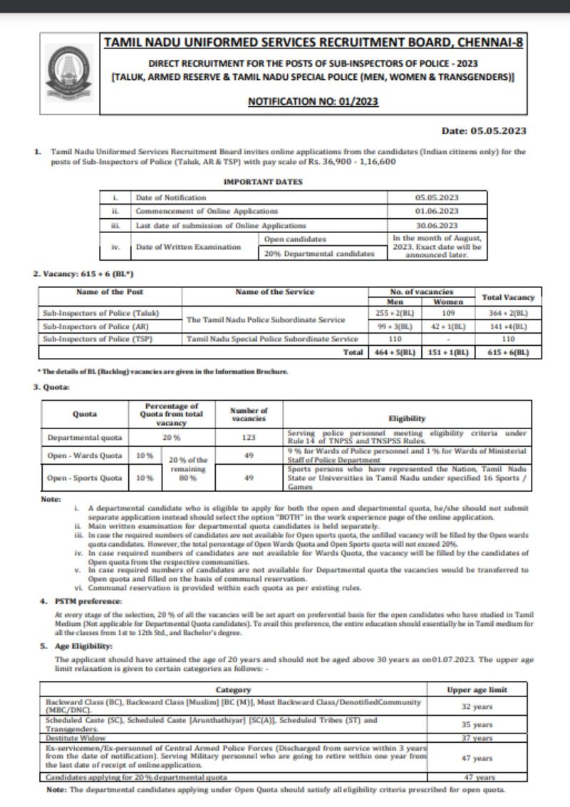 இதற்கு விண்ணப்பிக்க ஜூன் 1 முதல் ஜூன் 30 வரையில் கால அவகாசம் அளிக்கப்பட்டுள்ளது. tnusrb. tn. gov என்ற இணையதளம் சென்று மேலும் விவரங்களை அறிந்து கொள்ளலாம் என அறிவுறுத்தப்பட்டுள்ளது. இந்த வருடம் ஆகஸ்ட் மாதம் இதற்கான தேர்வு நடைபெறும் என்று தமிழ்நாடு சீருடைப் பணியாளர் தேர்வு வாரியம் தெரிவித்துள்ளது.