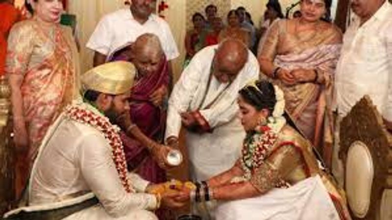 பிரபல நடிகரும், கர்நாடக முன்னாள் முதல்வர் எச்.டி.குமாரசாமியின் மகனுமான நிகில் குமாரசாமி - ரேவதி ஆகியோரின் திருமணம் இன்று மிகவும் எளிமையான முறையில் நடந்து முடிந்துள்ளது.
