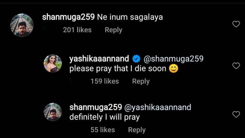 இந்த புகைப்படத்தை பார்த்த நெட்டிசன் ஒருவர், ‘நீ இன்னும் சாகலையா’ என கேட்டிருந்தார். இந்த கேள்வியால் மனமுடைந்து போன யாஷிகா, ’நான் சீக்கிரம் சாகனும்னு வேண்டிக்கோங்க’ என பதிலளித்தார். அதற்கு அந்த நெட்டிசன், ‘நான் நிச்சயம் வேண்டிக்கொள்கிறேன்’ என தெரிவித்தார். யாஷிகாவிடம் இவ்வாறு கேட்ட நெட்டிசனுக்கு வலைதள வாசிகள் கடும் எதிர்ப்பு தெரிவித்து வருகின்றனர். அதுமட்டுமின்றி தைரியமாக இருக்கும்படி யாஷிகாவுக்கு அறிவுரையும் கூறி வருகின்றனர்.