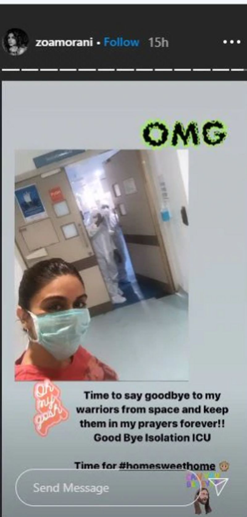 அதில், எனது கொரோனா வாரியஸுக்கு குட்பை சொல்ல வேண்டிய நேரம் வந்துவிட்டது. அவர்களுக்காக என்றேன்றும் பிரார்த்திக்கிறேன். குட்பை தனிமைப்படுத்தப்பட்ட ஐ.சி.யூ. என்று வீட்டிற்கு திரும்ப உள்ள சந்தோஷத்தை செம்ம குஷியாக பகிர்ந்துகொண்டுள்ளார். இவரது தங்கை ஷாஸா சில தினங்களுக்கு முன்பு கொரோனா தொற்றிலிருந்து மீண்ட நிலையில், சோவாவும் வீட்டிற்கு அனுப்பி வைக்கப்பட்டுள்ளார். தயாரிப்பாளர் கரீம் மோரானிக்கு கொரோனா தொற்று மீண்டும் உறுதி செய்யப்பட்டதை அடுத்து அவருக்கு தொடர் சிகிச்சை அளிக்கப்பட்டு வருகிறது.
