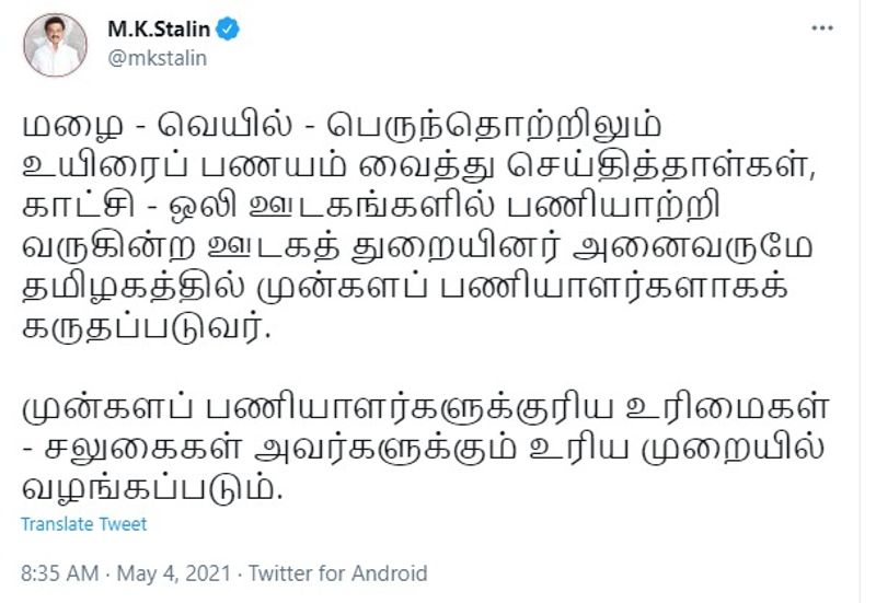 விரைவில் தமிழக முதல்வர் பதவியை ஏற்க உள்ள நிலையில்... ஸ்டாலின் தன்னுடைய ட்விட்டர் பக்கத்தில், "கடும் மழையிலும், கொளுத்தும் வெயிலிலும், பெருந்தொற்றிலும் உயிரைப் பணயம் வைத்து உழைக்கும் ஊடகத் துறையினர் முன்களப் பணியாளர்களாகத் தமிழகத்தில் கருதப்படுவார்கள். செய்தித்தாள்கள், காட்சி ஊடகங்கள், ஒலி ஊடகங்கள் போன்றவற்றில் பணியாற்றி வருகின்ற தோழர்கள் அனைவருமே இந்த வரிசையில் அடங்குவார்கள். முன்களப் பணியாளர்களுக்கான உரிமைகளும், சலுகைகளும் அவர்களுக்கு உரிய முறையில் வழங்கப்படும் என அறிவித்துள்ளார்.