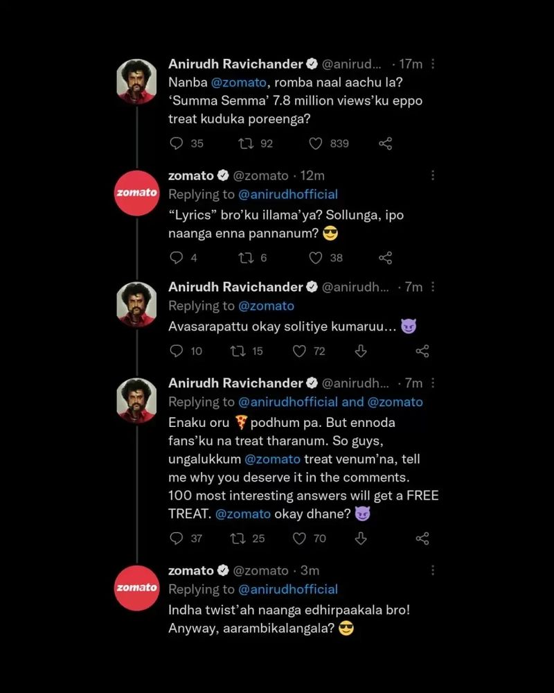 இதற்கு சோமேட்டோ நிறுவனம் அளித்த பதிலில், “ லிரிக்ஸ் ப்ரோவுக்கு இல்லாமையா? சொல்லுங்க நான் இப்போ என்ன பண்ணனும்? என கேட்டது. இதற்கு அவசரப்பட்டு ஓகே சொல்லிட்டியே குமாரு என ரிப்ளை செய்த அனிருத், எனக்கு ஒரு பீட்சா போதும், ஆனா என்னோட ரசிகர்களுக்கு நான் ட்ரீட் தரணும், அதனால உங்களுக்கு சோமேட்டோவுல ட்ரீட் வேணும்னா, ஏன் உங்களுக்கு நான் இத கொடுக்கணும்னு கமெண்ட் பண்ணுங்க. 100 சுவாரஸ்யமான பதில் அனுப்புபவர்களுக்கு இலவசமா ட்ரீட்.. சோமேட்டோ ஓகே தான? என பதிவிட, இதற்கு பதிலளித்த சோமேட்டோ, இந்த டுவிஸ்ட நாங்க எதிர்பாக்கல ப்ரோ! இருந்தாலும் ஆரம்பிக்கலாமா? என பதிவிட்டிருந்தது.