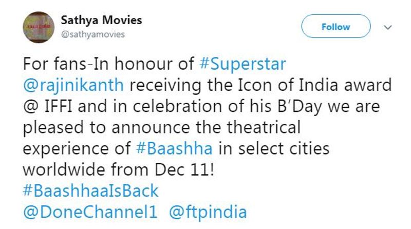 இதுதொடர்பாக அந்நிறுவனத்தின் அதிகாரப்பூர்வ டுவிட்டர் பக்கத்தில், ஐகான் ஆஃப் கோல்டன் ஜூப்ளி விருதை பெற்றதன் நினைவாகவும் மற்றும் சூப்பர் ஸ்டாரின் பிறந்தநாளை ரசிகர்கள் கொண்டாடும் விதமாகவும் வரும் டிசம்பர் 11ம் தேதி உலகம் முழுவதும் சில நகரங்களில் 'பாட்ஷா' படத்தை மீண்டும் ரிலீஸ் செய்யவுள்ளதாக அறிவித்துள்ளது.