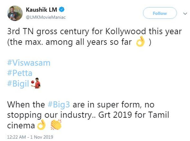 2019-ல் வெளியான தமிழ் படங்களில், தமிழகத்தில் மட்டும் ரூ.100 கோடி வசூல் செய்த 3-வது படம் 'பிகில்' என்ற பெருமையையும் பெற்றுள்ளது. பிகிலுக்கு முன்னதாக இந்த ஆண்டு வெளியான ரஜினியின் 'பேட்ட', அஜித்தின் 'விஸ்வாசம்' ஆகிய படங்கள் ரூ.100 கோடி வசூல் செய்து ஏற்கெனவே இந்த சாதனையை படைத்துள்ளன. திரையரங்குகளில் பிகில் படத்திற்கான காட்சிகள் குறைக்கப்பட்டுவிட்டதாகக் கூறப்பட்டாலும், இன்றைய சூழலில் ஒரு படம் ஒரு வாரம் கடந்தும் வெற்றிகரமாக திரையரங்குகளில் ஓடுவதே சாதனைதான். அப்படி பார்க்கையில், இன்றைய தினமும் வசூலில் பங்கம் இல்லாமல் கல்லா கட்டிவரும் பிகில் படம், இந்த ஆண்டின் மாபெரும் வெற்றிப்படம் என்பதில் எந்த மாற்றுக்கருத்தும் இல்லை.