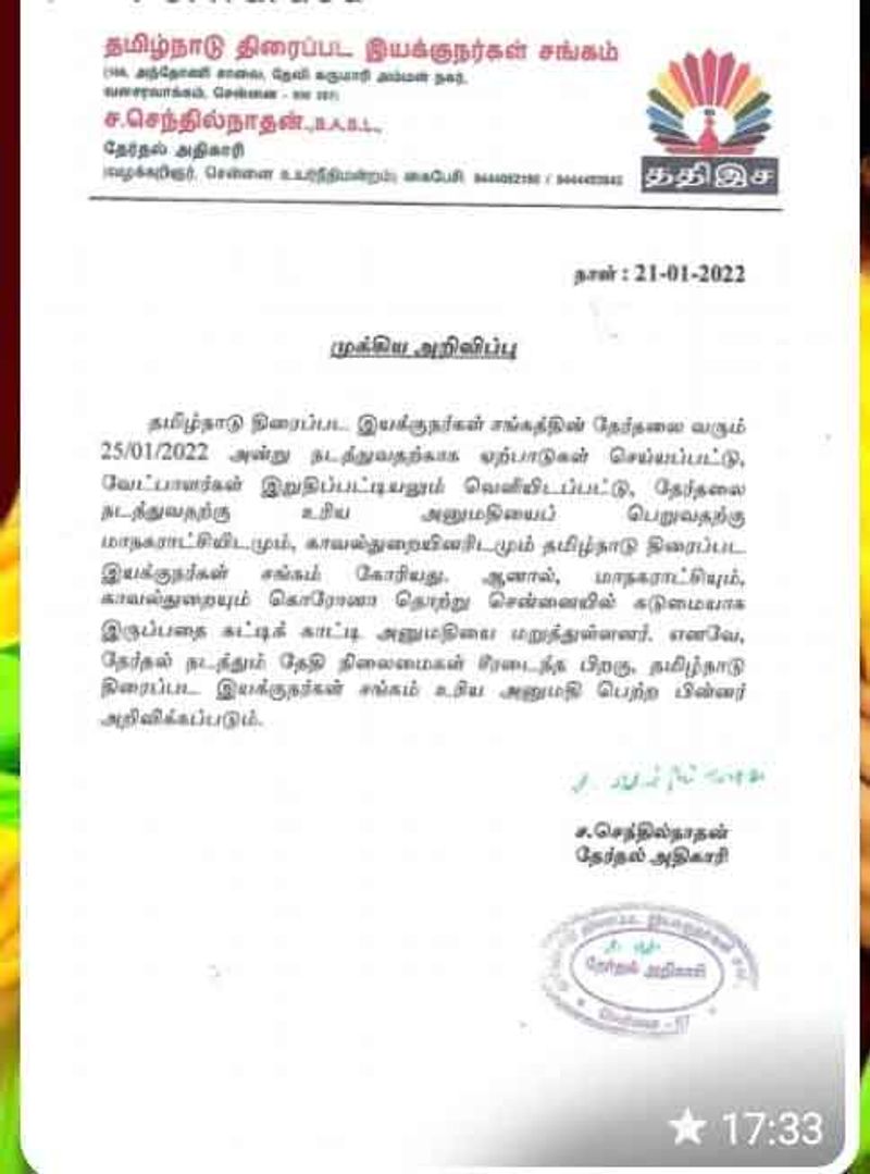 இது தொடர்பாக தேர்தல் அதிகாரி செந்தில்நாதன் வெளியிட்டுள்ள அறிக்கையில்;- தமிழ்நாடு திரைப்பட இயக்குநர்கள் சங்கத்தின் தேர்தலை வரும் 25/01/2022 அன்று நடத்துவதற்காக ஏற்பாடுகள் செய்யப்பட்டு, வேட்பாளர்கள் இறுதிப்பட்டியலும் வெளியிடப்பட்டு, தேர்தலை நடத்துவதற்கு உரிய அனுமதியைப் பெறுவதற்கு மாநகராட்சியிடமும், காவல்துறையினரிடமும் தமிழ்நாடு திரைப்பட இயக்குநர்கள் சங்கம் கோரியது.