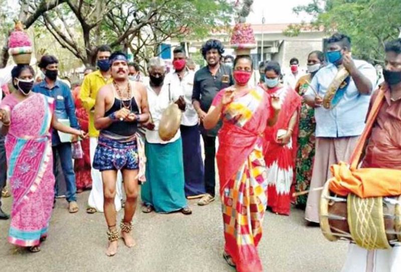 இதை தொடர்ந்து, மீண்டும் திருவிழாக்காலங்களில் போட்டப்பட்டுள்ள இந்த கட்டுப்பாடுகளால், தாங்கள் வாழ்வாதாரத்தை இழந்து உள்ளதாக, நாடக மற்றும் நாட்டுப்புற கலைஞர்கள் ஒன்று கூடி தமிழகம் முழுவதும் போராட்டத்தில் ஈடுபட்டு வருகிறார்கள். இந்த போராட்டத்தில், தப்பாட்டம், ஒயிலாட்டம் , மயிலாட்டம், கரகாட்டம், கூத்து பட்டறை கலைஞர்கள், நாடக கலைஞர்கள், கிராமிய இசை கலைஞர்கள் உள்ளிட்ட பலர் கலந்து கொண்டுள்ளனர்.