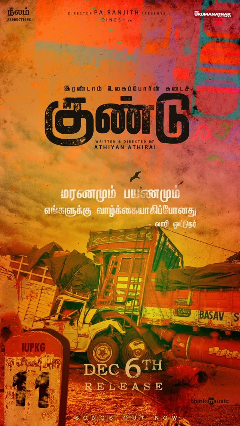 அறிமுக இயக்குநர் அதியன் ஆதிரை இயக்கியுள்ள "இரண்டாம் உலக போரின் கடைசி குண்டு" திரைப்படம் இன்று வெளியாகியுள்ளது. இந்தப் படத்தில் தினேஷ், ஆனந்தி, ரித்விகா, முனீஸ்காந்த், ஜான் விஜய் உள்ளிட்டோர் நடித்துள்ளனர். "பரியேறும் பெருமாள்" படத்தின் வெற்றியைத் தொடர்ந்து இயக்குநர் பா.ரஞ்சித் இப்படத்தை தயாரித்துள்ளார். அறிமுக இசையமைப்பாளர் தென்மாவின் இசையில் பாடல்கள் அனைத்தும் ரசிகர்களிடம் சிறப்பான வரவேற்பை பெற்றுள்ளது. கடலில் விழுந்த சக்தி வாய்ந்த குண்டு, சம்பந்தமே இல்லாத அப்பாவி மக்களுக்கு மத்தியில் வெடித்தால் எப்படி இருக்கும் என்பதை மையமாக கொண்டு கதைக்களம் வடிவமைக்கப்பட்டுள்ளது.