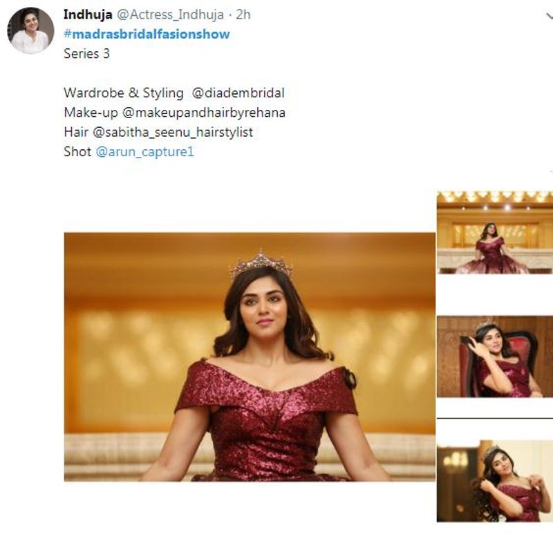 அந்த வகையில், சென்னையில் நடைபெற்ற மெட்ராஸ் பிரைடல் ஃபேஷன் ஷோ நிகழ்ச்சியில் இந்துஜா கலந்து கொண்டார். இதில், வார்ட்ரோப் ஸ்டைலில் பிரத்யேகமாக வடிவமைக்கப்பட்ட ஆடையில், தலையில் கிரீடத்துடன் மகாராணி போல் ஒய்யார நடை நடந்து வந்து காண்போரை சொக்கவைத்தார்.