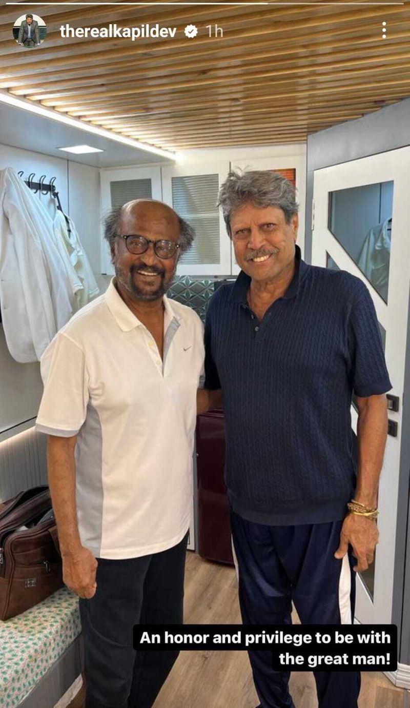 இவர்களை தொடர்ந்து, மற்றொரு கிரிக்கெட் ஜாம்பவான் சூப்பர் ஸ்டார் ரஜினிகாந்தை லால் சலாம் படத்தின் ஷூட்டிங் ஸ்பாட்டில் சந்தித்து பேசியுள்ளதாக தெரிகிறது. கேரவனின் இருக்கும் போது, எடுத்து கொண்ட புகைப்படத்தை, கபில் தேவ் தன்னுடைய இன்ஸ்டாகிராம் பக்கத்தில் பகிர்ந்து ரஜினியுடனான சந்திப்பு குறித்து தெரிவித்துள்ளார்.
