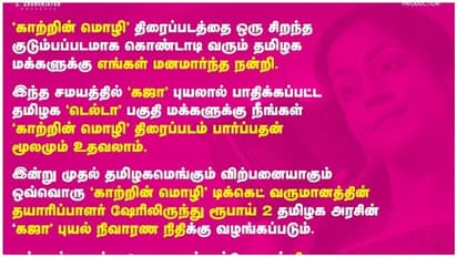 திரையுலகினர் மத்தியிலிருந்து சற்றே மந்தமாகத்தான் கஜா புயல் நிவாரண உதவிகள் வந்துகொண்ட்ருக்கின்றன. இன்னும் விக்ரம், அஜீத்,விஜய்,சிம்பு போன்ற டாப் ஸ்டார்கள் உதவ முன்வராத நிலையில் ‘காற்றின் மொழி’ படத்தயாரிப்பாளர் தனஞ்செயனும் இயக்குநர் ராதாமோகனும் ஒரு முக்கிய அறிவிப்பை வெளியிட்டிருக்கிறார்கள்.