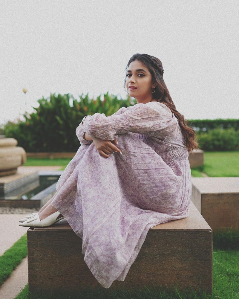 வெள்ளியன்று, கீர்த்தி இன்ஸ்டாகிராமில் ஐவரி சூட் செட் அணிந்திருந்த பல படங்களை, "#VaashiPromotions மீதான எனது அன்பை ஆளுகிறேன்" என்ற தலைப்புடன் பகிர்ந்தார். பிரபல ஒப்பனையாளர் அர்ச்சா மேத்தா இந்த நிகழ்விற்கு நடிகையை ஸ்டைல் செய்தார். சூட் செட்டில் உள்ள அப்ளிக் பேட்ச்வொர்க், அசையும் மரங்கள் மற்றும் ஃபிளமிங்கோக்களின் விமானங்களை சித்தரிக்கிறது, இது கோடையில் வெப்பத்தைத் தணிக்க சிறந்த தேர்வாக அமைகிறது. இந்த சூட்டின் மதிப்பு ரூ.1 லட்சம் என சொல்லப்படுகிறது.