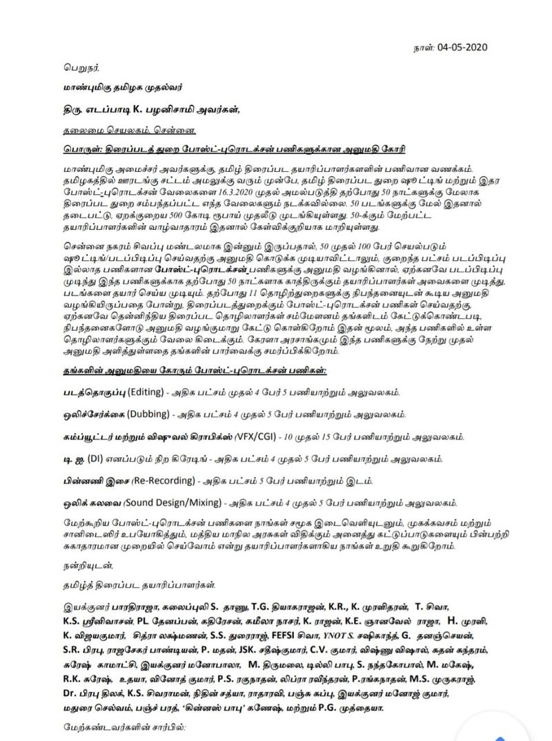 சென்னை நகரம் சிவப்பு மண்டலமாக இன்னும் இருப்பதால், 50 முதல் 100 பேர் செயல்படும் ஷூட்டிங்/படப்பிடிப்பு செய்வதற்கு அனுமதி கொடுக்க முடியாவிட்டாலும், குறைந்த பட்சம் படப்பிடிப்பு இல்லாத பணிகளான போஸ்ட்-புரொடக்சன் பணிகளுக்கு அனுமதி வழங்கினால், ஏற்கனவே படப்பிடிப்பு முடிந்து இந்த பணிகளுக்காக தற்போது 50 நாட்களாக காத்திருக்கும் தயாரிப்பாளர்கள் அவைகளை முடித்து, படங்களை தயார் செய்ய முடியும். தற்போது 11 தொழிற்துறைகளுக்கு நிபந்தனையுடன் கூடிய அனுமதி வழங்கியிருப்பதை போன்று, திரைப்படத்துறைக்கும் போஸ்ட்-புரொடக்சன் பணிகள் செய்வதற்கு, ஏற்கனவே தென்னிந்திய திரைப்பட தொழிலாளர்கள் சம்மேளனம் தங்களிடம் கேட்டுக்கொண்டபடி, நிபந்தனைகளோடு அனுமதி வழங்குமாறு கேட்டு கொள்கிறோம்.