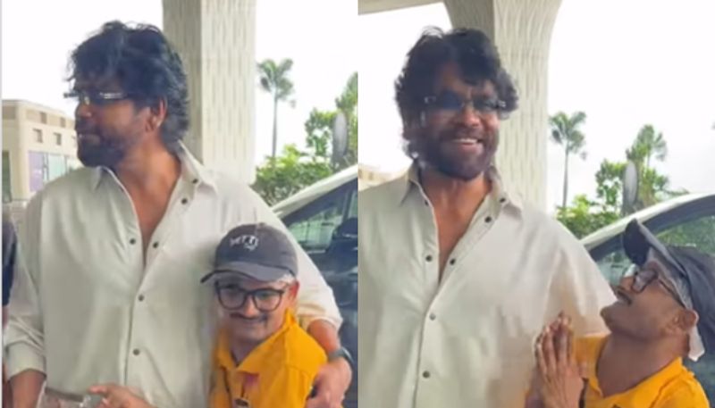 படப்பிடிப்பு முடிந்து மீண்டும் ஹைதராபாத் திரும்ப... மீண்டும் மும்பை விமான நிலையம் வந்த நாகார்ஜுனா தன்னுடைய பாதுகாவலரால் தள்ளிவிடப்பட்ட அந்த நபரை சந்தித்து, அவரை ஆசையை பூர்த்தி செய்யும் விதமாக அவரின் தோல் மேல் கை போட்டு புகைப்படம் எடுத்துக் கொண்டார். மேலும் நாகார்ஜுனாவுடன் மற்ற சில ரசிகர்களும் புகைப்படம் எடுத்து கொண்டனர். இது குறித்த வீடியோ சமூக வலைதளத்தில் தற்போது வெளியாகி வைரலாக பார்க்கப்பட்டு வருகிறது.