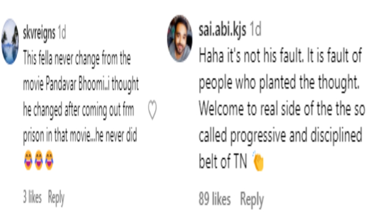 இவர் "பாண்டவர் பூமி" படத்தில் இருந்து இன்னும் மீண்டு வரளவில்லை போல, அப்போதும் அப்படித்தான் கொலை செய்துவிட்டு ஜெயிலுக்கு சென்று திரும்பினார். இப்பொது மீண்டும் அதுபோல ஜெயிலுக்கு போகப்போகிறார் என்று ஒரு நெட்டிசன் கூறியுள்ளார்.