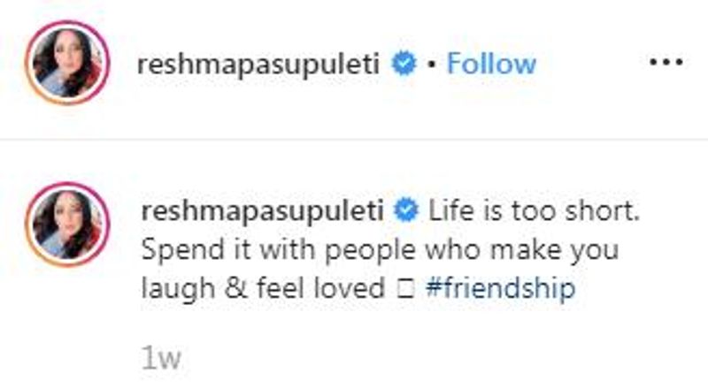 அதற்கேற்றார்போல், சமீபத்தில் தனது இன்ஸ்டாகிராம் பக்கத்தில் நிஷாந்த் ரவிந்திரன் என்பவருடன் எடுத்துக்கொண்ட புகைப்படத்தை பகிர்ந்திருந்தார் ரேஷ்மா. அந்த பதிவில், "வாழ்க்கை மிகவும் சிறியது. அதனால் உங்களை சந்தோஷமாக வைத்துக்கொள்பர்களுடன் வாழ்நாளை செலவிடுங்கள்" என்று குறிப்பிட்டிருந்தார்.
