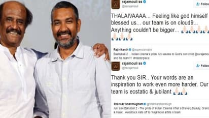 ரஜினியின் ட்வீட் மேற்கோளிட்டு 'தலைவா... கடவுளே வாழ்த்தியதுபோல் உணர்கிறேன்' என்றார் இயக்குநர் ராஜமெளலி ஒட்டுமொத்த குழுவும் பெருமகிழ்ச்சியில் இருக்கிறது. இதைவிட சிறந்த வாழ்த்து ஏதுமில்லை" என்று தெரிவித்துள்ளார்.
