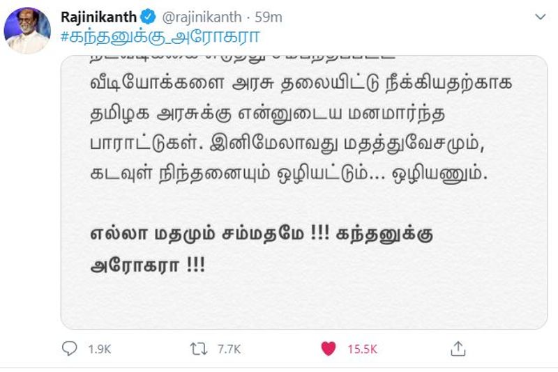 இந்நிலையில் சூப்பர் ஸ்டார் ரஜினிகாந்த், தமிழக அரசின் இந்த நடவடிக்கைக்கு நன்றி தெரிவிக்கும் விதத்தில், தன்னுடைய ட்விட்டர் பக்கத்தில், கந்த சஷ்டி கவசத்தை மிகக் கேவலமாக அவதூறு செய்து, பல கோடி தமிழ் மக்களின் மனதைப் புண்படுத்தி கொந்தளிக்கச் செய்த, இந்த ஈனச் செயலை வாழ்க்கையில் மறக்க முடியாதபடி செய்தவர்கள் மீது துரிதமாக நடவடிக்கை எடுத்து சம்பந்தப்பட்ட வீடியோக்களை அரசு தலையிட்டு நீக்கியதற்கு தமிழக அரசுக்கு என்னுடைய மனமார்ந்த பாராட்டுகள். இனிமேலாவது மதத்துவேசமும், கடவுள் நிந்தனையும் ஒழியட்டும்... ஒழியணும்.. எல்லா மதமும் சம்மதமே!!! கந்தனுக்கு அரோகரா!!! என பதிவிட்டிருந்தார்.