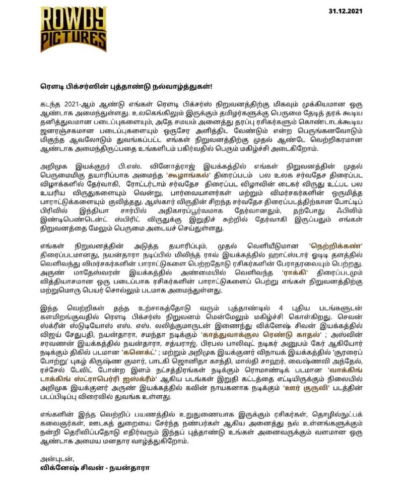மேலும். நெற்றிக்கண், ராக்கி திரைப்படங்களுக்கு கிடைத்த நேர்மறையான விமர்சனங்கள் மூலம் அவை தங்கள் நிறுவனத்துக்கு பெயர் சொல்லும் படங்களாக அமைந்ததாக பெருமையுடன் இருவரும் கூறியுள்ளனர். அடுத்த ஆண்டில் காத்துவாக்குல ரெண்டு காதல், கனெக்ட், வாங்கிங், டாக்கிங் ஸ்ட்ராபெர்ரி ஐஸ்கிரீம், ஊர்குருவி ஆகிய 4 புதிய படங்களுடன் ரௌடி பிக்சர்ஸ் களத்தில் இறக்க உள்ளதாகவும் விக்னேஷ் சிவன் - நயன்தாரா மகிழ்ச்சியொடு தெரிவித்துள்ளனர்.