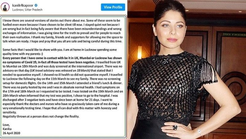 மேலும் தன்னுடைய உடல் நிலை மோனமானதை தொடர்ந்து 19 ஆம் தேதி மருத்துவ மனையில் தான் அனுமதிக்கப்பட்டதாகவும், 20 ஆம் தேதி எடுக்கப்பட்ட சோதனையில் தனக்கு கோரோனோ பாசிட்டிவ் என வந்ததாகவும் தெரிவித்துள்ளார். இதை தொடர்ந்து மூன்று முறை கொரோனா நெகடிவ் என வந்த பின்பு தான் மீண்டும் தான் வீடு திரும்பியதாக பாடகி கனிகா கபூர் கூறி இதுவரை வெளியான வதந்திகளுக்கு முற்றுப்புள்ளி வைத்துள்ளார்.