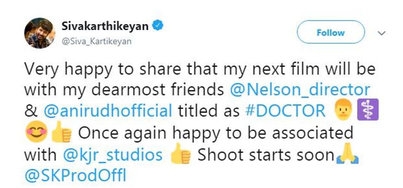 இதுதொடர்பான அதிகாரப்பூர்வ அறிவிப்பை வீடியோவுடன் தனது டுவிட்டர் பக்கத்தில் மகிழ்ச்சியுடன் பகிர்ந்திருக்கும் சிவகார்த்திகேயன், விரைவில் 'டாக்டர்' படத்தின் படப்பிடிப்பு தொடங்கவுள்ளதாகவும் தெரிவித்துள்ளார்.