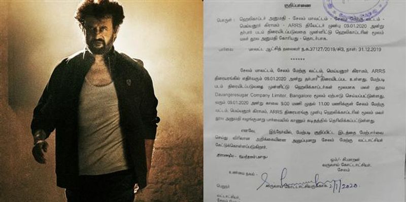 "தர்பார்" படத்தின் புரோமோஷனுக்காக லைகா நிறுவனம் காட்டும் தீவிரத்தை விட, பட ரிலீஸ் அன்று பட்டையைக் கிளப்ப சூப்பர் ஸ்டார் ரசிகர்கள் தீர்மானித்துவிட்டனர். சேலத்தில் உள்ள ஏ.ஆர்.ஆர்.எஸ். மல்டி ப்ளக்ஸ் தியேட்டரில் உள்ள 5 திரையரங்குகளிலும் தர்பார் திரைப்படம் ரிலீஸ் ஆக உள்ளது. அங்கு வைக்கப்பட உள்ள சூப்பர் ஸ்டாரின் கட் அவுட்டிற்கு ஹெலிகாப்டரில் இருந்து மலர் தூவ சேலம் மாவட்ட ஆட்சியர் உட்பட 6 துறைகளிடம் அனுமதி கோரப்பட்டது.
