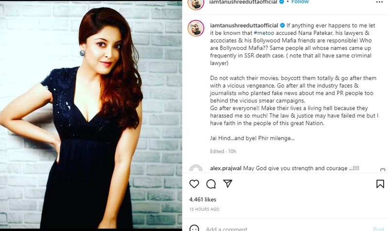 பாலிவுட் மாஃபியா கும்பல் என்றால், நடிகர் சுஷாந்த் சிங்கின் மரணத்தின் போது ஒருசிலரின் பெயர்கள் வெளியே வந்ததே அவர்கள் தான். என்னை துன்புறுத்திய அவர்களின் வாழ்க்கையை நரகமாக்குமாறும், சட்டம் தன் பக்கம் துணை நிற்காமல் போனாலும், மக்கள் மீது தனக்கு அதிக நம்பிக்கை இருப்பதாகவும் தனுஸ்ரீ அந்த பதிவில் குறிப்பிட்டுள்ளார். நடிகர் நானா படேகர் ரஜினியின் காலா படத்தில் வில்லனாக நடித்தவர் என்பது குறிப்பிடத்தக்கது.