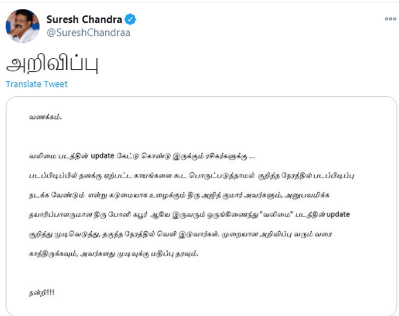 கடந்த சில நாட்களுக்கு முன்பு தல அஜித்தின் வலிமை படம் குறித்து அவருடைய மேனேஜர் சுரேஷ் சந்திரா அறிக்கை ஒன்றை வெளியிட்டிருந்தார். “வலிமை படத்தின் update கேட்டு கொண்டு இருக்கும் ரசிகர்களுக்கு... படப்பிடிப்பில் தனக்கு ஏற்பட்ட காயங்களை கூட பொருட்படுத்தாமல் குறித்த நேரத்தில் படப்பிடிப்பு நடக்க வேண்டும் என்று கடுமையாக உழைக்கும் திரு அஜித் குமார் அவர்களும், அனுபவமிக்க தயாரிப்பாளருமான திரு போனி கபூர் ஆகிய இருவரும் ஒருங்கிணைந்து "வலிமை" படத்தின் update குறித்து முடிவெடுத்து, தகுந்த நேரத்தில் வெளி இடுவார்கள். முறையான அறிவிப்பு வரும் வரை காத்திருக்கவும், அவர்களது முடிவுக்கு மதிப்பு தரவும்” என கூறியிருந்தார்.