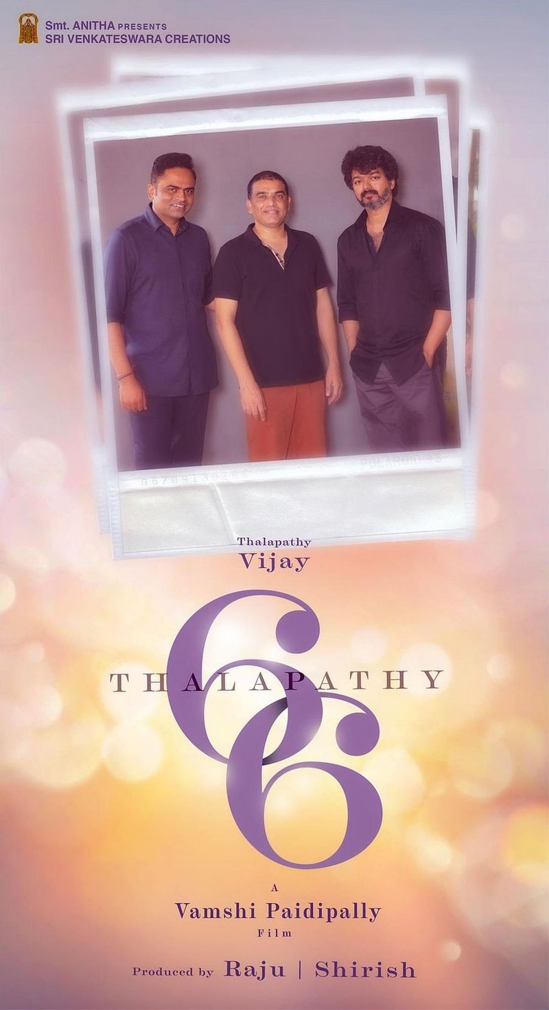 இந்த நிலையில் தற்போது, விஜய்யின் 66 ஆவது படம் குறித்து புதிய போஸ்டர் ஒன்றை வெளியிட்டு இந்த படம் குறித்த தகவலை வெளியிட்டு அறிவித்துள்ளது தயாரிப்பு நிறுவனம். வம்சி இயக்கும் இந்த படத்தை, தெலுங்கில் பல வெற்றிப்படங்களை தயாரித்துள்ள, தில் ராஜு, தன்னுடைய ஸ்ரீ வெங்கடேஸ்வரா கிரியேஷன்ஸ் மூலம் பிரமாண்டமாக தயாரிக்க உள்ளார். இவர்கள் மூவரும் இணைந்து எடுத்து கொண்ட புகைப்படத்தை வெளியிட்டு 66 பட தகவலை உறுதி செய்துள்ளனர். தளபதி விஜய், இந்த புகைப்படத்தில் செம்ம ஸ்டைலிஷாக இருக்கிறார்.