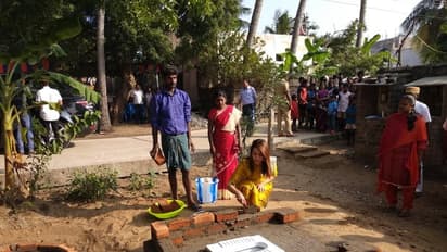 இந்த நிலையில் நேற்று காஞ்சிபுரம் அருகில் உள்ள வட நெமிலி என்ற கிராமத்திற்கு சென்று கழிப்பறை கட்டுவதில் மக்களிடேயே விழிப்புணர்வை ஏற்படுத்த அவரே செங்கல் எடுத்து அடுக்கி உதவி செய்தார்.