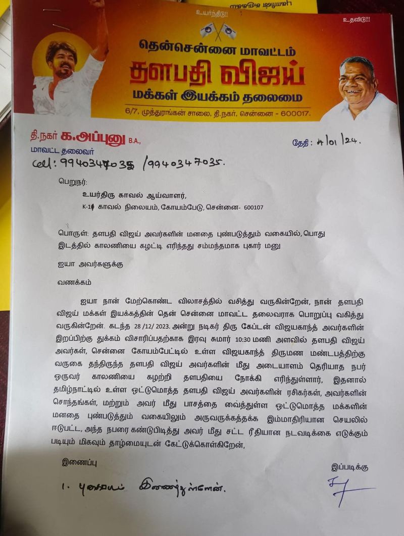 இந்த நிலையில், விஜய் மீது காலணி வீசப்பட்டது தொடர்பாக நடவடிக்கை எடுக்ககோரி தென் சென்னை மாவட்ட விஜய் மக்கள் இயக்கம் சார்பில் கோயம்பேடு காவல் நிலையத்தில் புகார் அளிக்கப்பட்டு உள்ளது. அந்த புகாரில், கடந்த 28/12/ 2023. அன்று நடிகர் கேப்டன் விஜயகாந்த் அவர்களின் இறப்பிற்கு துக்கம் விசாரிப்பதற்காக இரவு சுமார் 10:30 மணி அளவில் தளபதி விஜய் அவர்கள், சென்னை கோயம்பேட்டில் உள்ள விஜயகாந்த் திருமண மண்டபத்திற்கு வருகை தந்திருந்தார்.