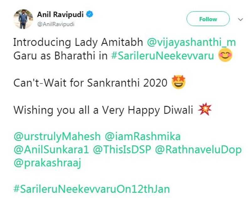 இந்தப் படத்தின் மூலம் 13 ஆண்டுகளுக்குப் பிறகு மீண்டும் அவர், திரையில் ஜொலிக்க உள்ளார். வரும் சங்கராந்திக்கு 'சரிலேறு நீக்கெவரு' ரிலீஸ் என அறிவிக்கப்பட்டுள்ள நிலையில், தீபாவளி பண்டிகையை முன்னிட்டு, விஜயசாந்தியின் ஃபர்ஸ்ட் லுக்கை வெளியிட்டு படக்குழு இன்ப அதிர்ச்சி அளித்துள்ளது.