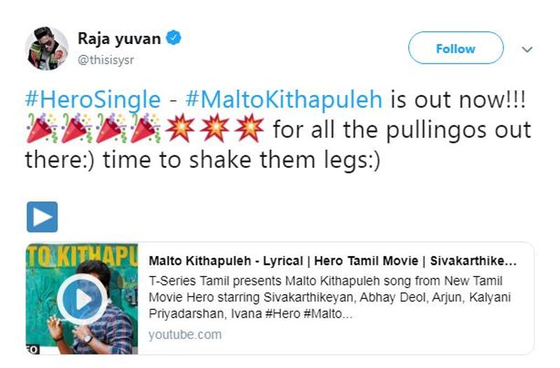 யுவனின் துள்ளலான இசையில், ரோகேஷ் எழுதியுள்ள இந்தப் பாடலை, ஷ்யாம் விஸ்வாதன் பாடியுள்ளார். பிரபல நடன இயக்குநர் ராஜுசுந்தரம் இந்தப் பாடலுக்கு நடனம் அமைத்துள்ளார். யுவன் - சிவகார்த்திகேயன் காம்பினேஷனில் வந்திருக்கும் 'மால்டோ கிட்டபுலே' பாடல், ரசிகர்களை ஆட்டம் போட வைத்துள்ளது.