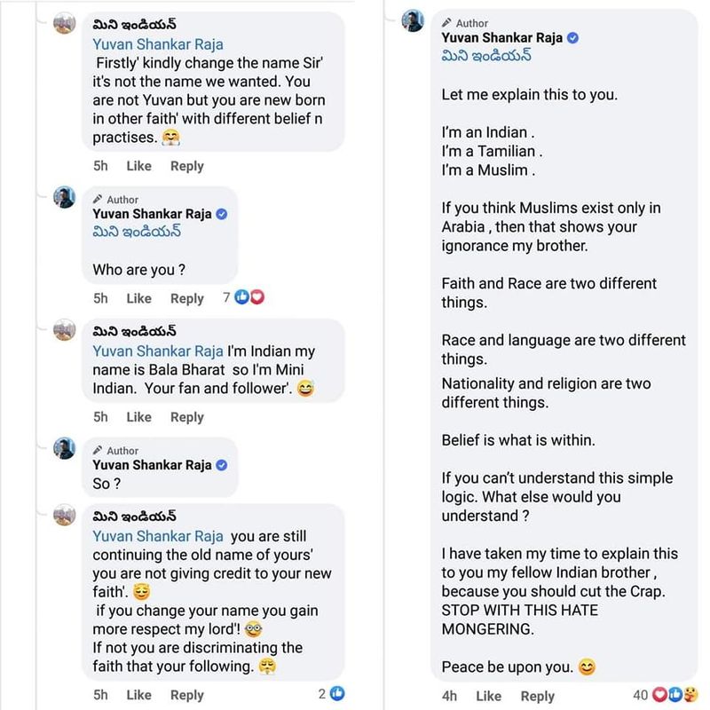 இந்த அடிப்படை விஷயத்தைக் கூட புரிந்து கொள்ளாதவர்களுக்கு வேறு எதுவும் புரியாது. தயவுசெய்து வெறுப்பு பிரச்சாரத்தை நிறுத்துங்கள். அமைதி நிலவட்டும்’ என்று பதிலடி கொடுத்துள்ளார். யுவன் ஷங்கர் ராஜாவை கோபப்படுத்தும் விதமாக பல்வேறு கேள்விகளை எழுப்பிய போதும், அதனை நாசுக்காக சமாளித்து இவர் பதில் கொடுத்துள்ளதற்கு பலர் பாராட்டுக்களை தெரிவித்து வருகிறார்கள்.
