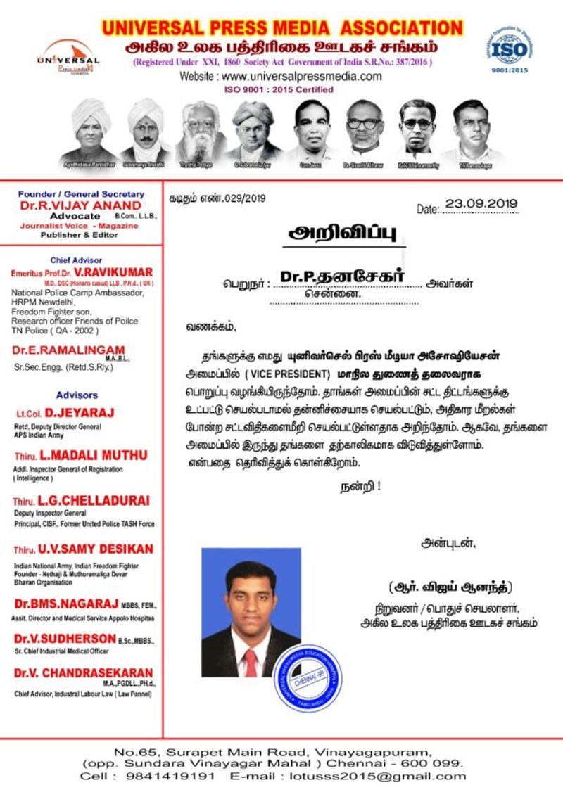 ஊடகச்சங்கத்தில் இருந்து முன்பே தனசேகரன் நீக்கப்பட்டதற்கான கடிதம் இது. தனசேகர் தான் போலியே தவிர; சங்கம் அல்ல. இதனிடையே, தனசேகரன் முன்பு பொறுப்பில் இருந்த அகில உலக பத்திரிகை ஊடகச்சங்கத்தின் நிறுவனரும், பொதுச் செயலாளருமான விஜய் ஆனந்த் கூறியதாவது, ’’புகாருக்குள்ளான தனசேகரை, கடந்த 23.09.2019இல் சங்கத்தில் இருந்து நீக்கிவிட்டோம்.