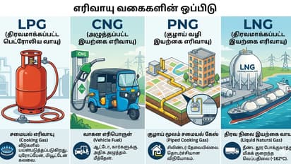 Difference between LPG CNG PNG LNG : இந்தியாவில் அதிகம் பயன்படுத்தப்படும் முக்கிய எரிவாயுக்களான LPG, CNG, PNG, LNG ஆகியவற்றின் 4 எரிவாயுக்கள் குறித்தும், அதில் உள்ள முக்கிய வேறுபாடுகள் குறித்தும் இந்த பதிவில் விரிவாகப் பார்க்கலாம்.