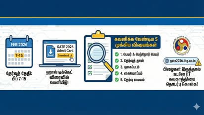 GATE 2026 GATE 2026 ஹால் டிக்கெட் எப்போது வெளியாகும்? டவுன்லோட் செய்வது எப்படி? ஹால் டிக்கெட்டில் கவனிக்க வேண்டிய 5 விஷயங்கள் மற்றும் தேர்வு தேதிகள் இதோ.