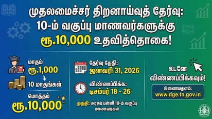 தமிழகத்தில் அரசுப் பள்ளிகளில் பயிலும் மாணவர்களின் தனித்திறனை ஊக்குவிக்கும் வகையில், தமிழக அரசு பல்வேறு நலத்திட்டங்களை செயல்படுத்தி வருகிறது. அந்த வகையில், 10-ம் வகுப்பு மாணவர்களுக்கு மாதம்தோறும் உதவித்தொகை வழங்கும் 'முதலமைச்சர் திறனாய்வுத் தேர்வு' (TN Chief Minister Talent Search Exam) குறித்த முக்கிய அறிவிப்பு தற்போது வெளியாகியுள்ளது.