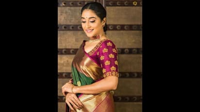 பச்சை நிற பட்டு சேலை, அதற்க்கு ஏற்ற போல் டிசைனர் ப்ளௌஸ் என கொள்ளை அழகில் மிளிர்கிறார்.