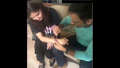 தோனியின் கால்களை கடித்து குறும்பு செய்யும் மனைவி