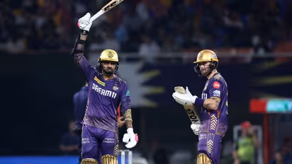 அடுத்து வந்த அங்கிரிஷ் ரகுவன்ஷி அதிரடி காட்டவே, சுனில் நரைன் 39 பந்துகளில் 6 பவுண்டரி, 7 சிக்ஸர் உள்பட 81 ரன்கள் எடுத்து ஆட்டமிழந்தார். அதன் பிறகு ரகுவன்ஷி 32 ரன்னிலும், ஆண்ட்ரே ரஸல் 12 ரன்னிலும் ஆட்டமிழந்தனர். ரிங்கு சிங் 16 ரன்களில் வெளியேறினார். கடைசியில் ஷ்ரேயாஸ் ஐயர் 23 ரன்கள் எடுக்கவே, ராமன் தீப் சிங் 6 பந்துகளில் ஒரு பவுண்டரி, 3 சிக்ஸர் உள்பட 25 ரன்கள் எடுத்து ஆட்டமிழக்காமல் இருந்தார்.